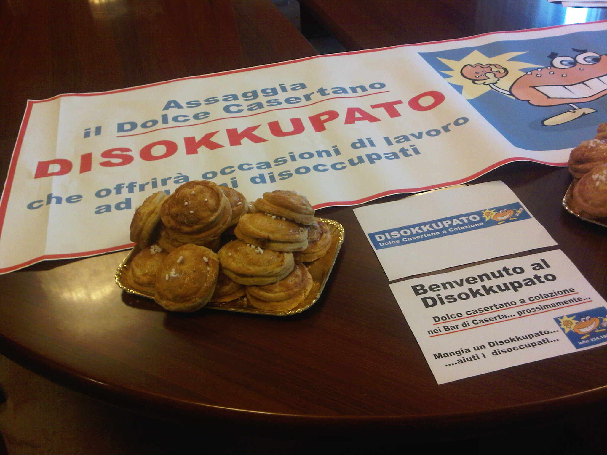 "Un'idea geniale, coraggiosa, significativa e orgogliosamente casertana. Un'idea che dà la misura reale di quanti si impegnano per il rilancio di Caserta. Una provocazione virtuosa, che può diventare un'opportunità concreta per chi è senza lavoro. Se "Caffè e Disokkupato" diventasse l'impegno di ogni casertano che si reca in un bar, il risultato sarebbe raggiunto". Così il sindaco Pio Del Gaudio ha presentato in Comune il dolce da bar "Disokkupato' intorno al quale il suo ideatore Giuseppe Cirillo sta programmando un'iniziativa per favorire un sistema di distribuzione nei bar cittadini che possa impegnare chi è senza lavoro.