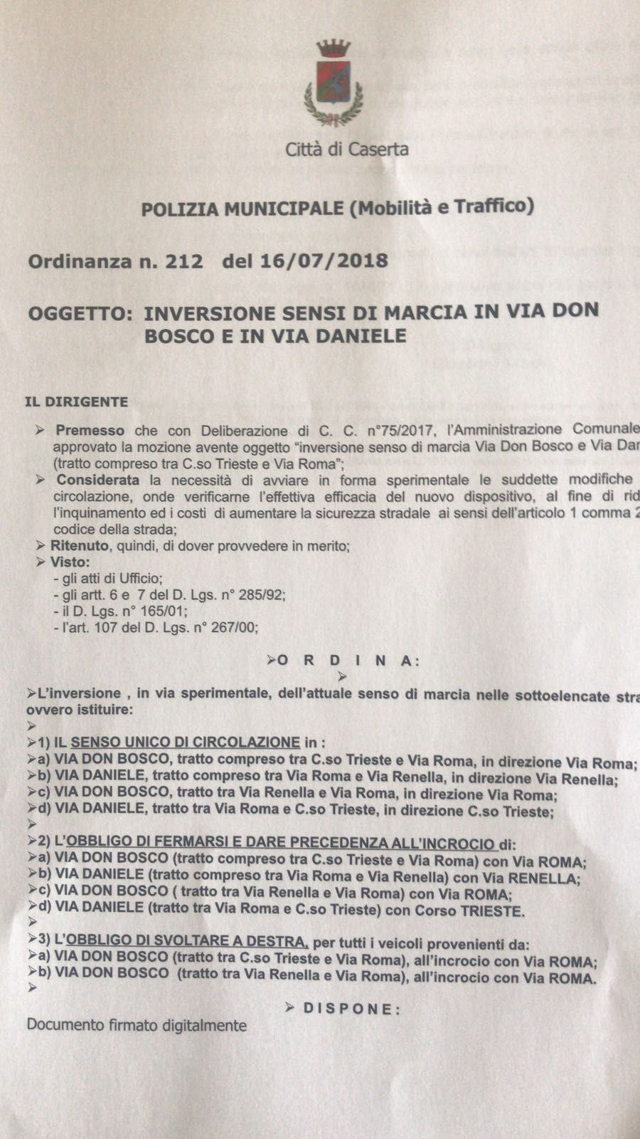 Il dirigente del Settore Mobilità e Traffico, Giovanni Natale, ha firmato un’ordinanza con la quale si stabilisce, in via sperimentale, l’inversione del senso di marcia di via Don Bosco e di via Daniele. In particolare, viene istituito il senso unico di circolazione in via Don Bosco, nel tratto compreso tra corso Trieste e via Roma, in direzione via Roma; in via Daniele, nel tratto tra via Roma e via Renella (via Napoli), in direzione via Renella; in via Don Bosco (tratto via Renella-via Roma, in direzione via Roma) e in via Daniele, nel tratto compreso tra via Roma e corso Trieste, in direzione corso Trieste. Inoltre, è previsto l’obbligo di fermarsi e dare precedenza all’incrocio di via Don Bosco (tratto compreso tra corso Trieste e via Roma) con via Roma; di via Daniele (tratto via Roma-via Renella), con via Renella; di via Don Bosco (tratto via Renella-via Roma) con via Roma; di via Daniele (tratto via Roma-corso Trieste) con corso Trieste.