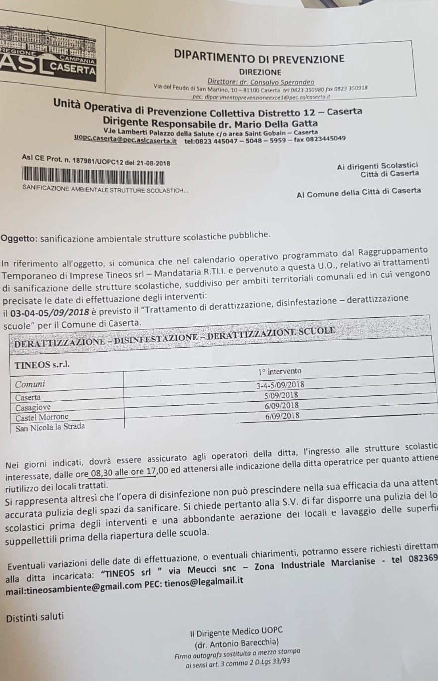 ASL CASERTA, SANIFICAZIONE AMBIENTALE STRUTTURE SCOLASTICHE PUBBLICHE DELLA CITTA' I GIORNI 3-4-5 SETTEMBRE