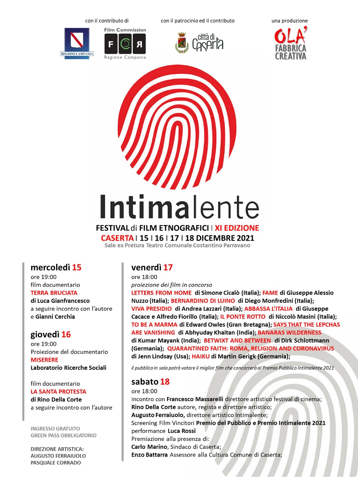 Alle ore 18,00 la serata finale del sabato inizierā con una tavola rotonda sul cinema documentaristico e antropologico, con Francesco Massarelli, Rino Della Corte, Augusto Ferraiuolo, a cui seguirā la proiezione del film vincitore del Premio Intimalente 2021. Prima della proclamazione e della consegna del premio, affidata al Sindaco Carlo Marino e ad Enzo Battarra, assessore alla Cultura del Comune di Caserta, ci sarā una performance di Luca Rossi.