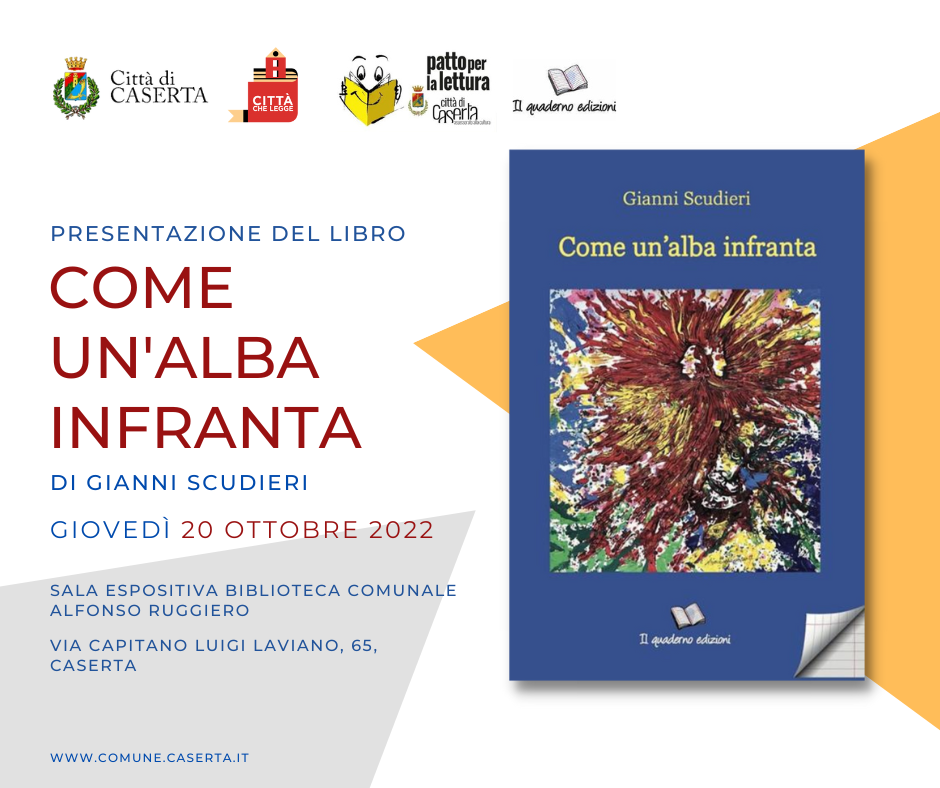 Giovedì 20 ottobre alle 18 la Biblioteca Ruggiero del Comune di Caserta ospiterà la presentazione del libro di Gianni Scudieri "Come un'alba infranta".