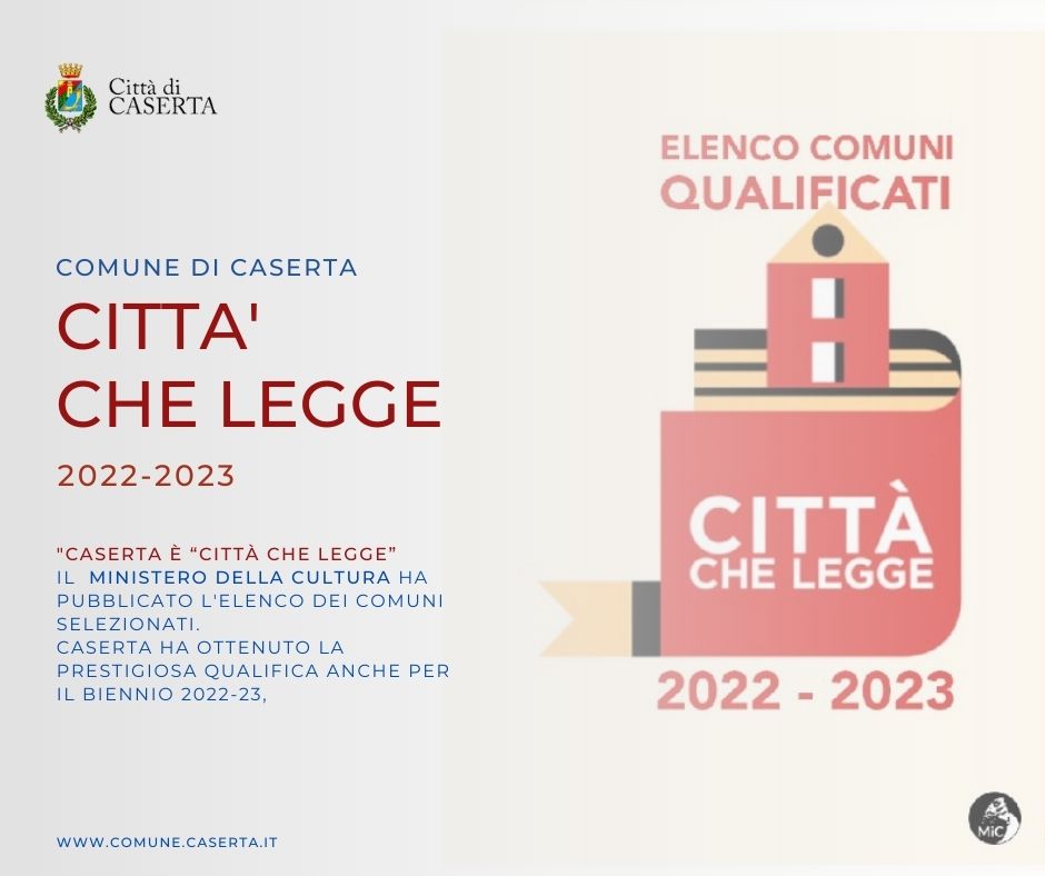 Caserta è “Città che legge”. Lo ha reso noto il Ministero della Cultura, che ha pubblicato l'elenco dei comuni selezionati. Caserta ha così ottenuto la prestigiosa qualifica anche per il biennio 2022-23, dimostrando di avere i requisiti richiesti dall'avviso pubblico reso noto nello scorso giugno. Tra i requisiti, novità rispetto ai bienni precedenti, l'aver già stipulato un “Patto per la lettura” che coinvolgesse nella promozione della lettura le realtà del territorio.