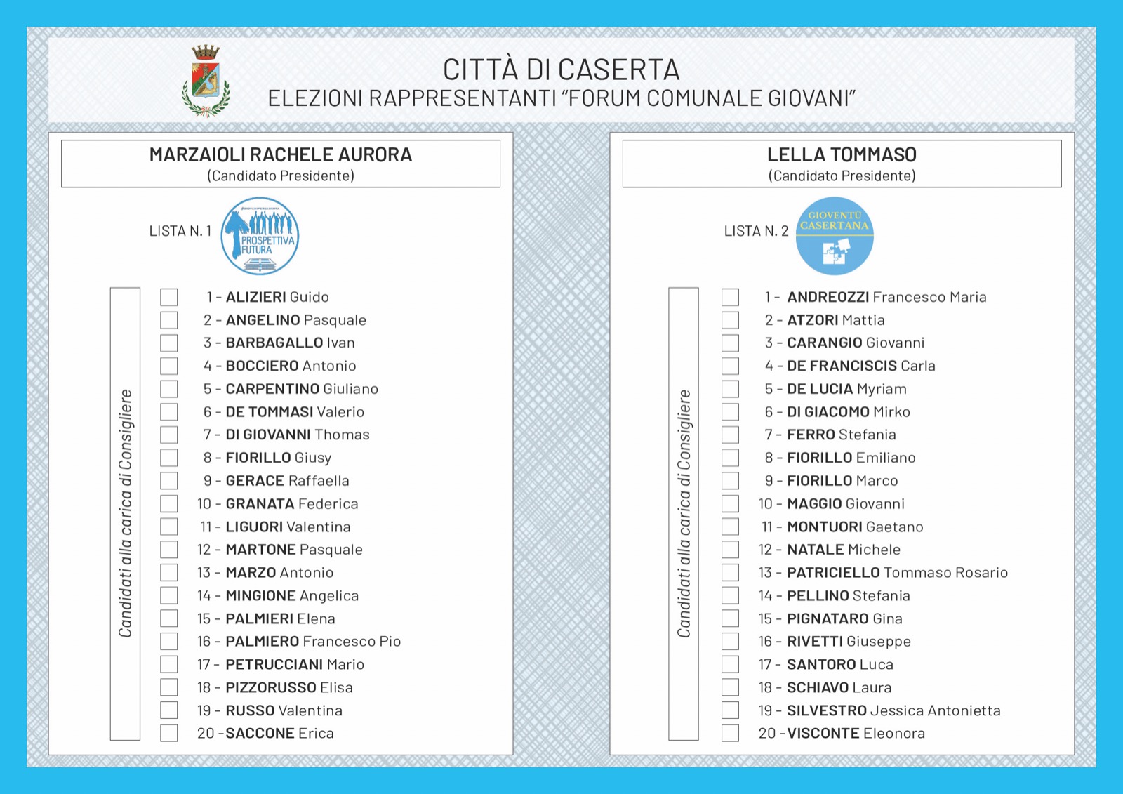 Sabato 14 gennaio, presso la Caserma Sacchi in via San Gennaro a Falciano, dalle ore 9 alle ore 20 si svolgeranno le procedure di voto per l’elezione del Presidente del Forum dei Giovani di Caserta e dei 20 consiglieri che andranno a comporre l’Assemblea.