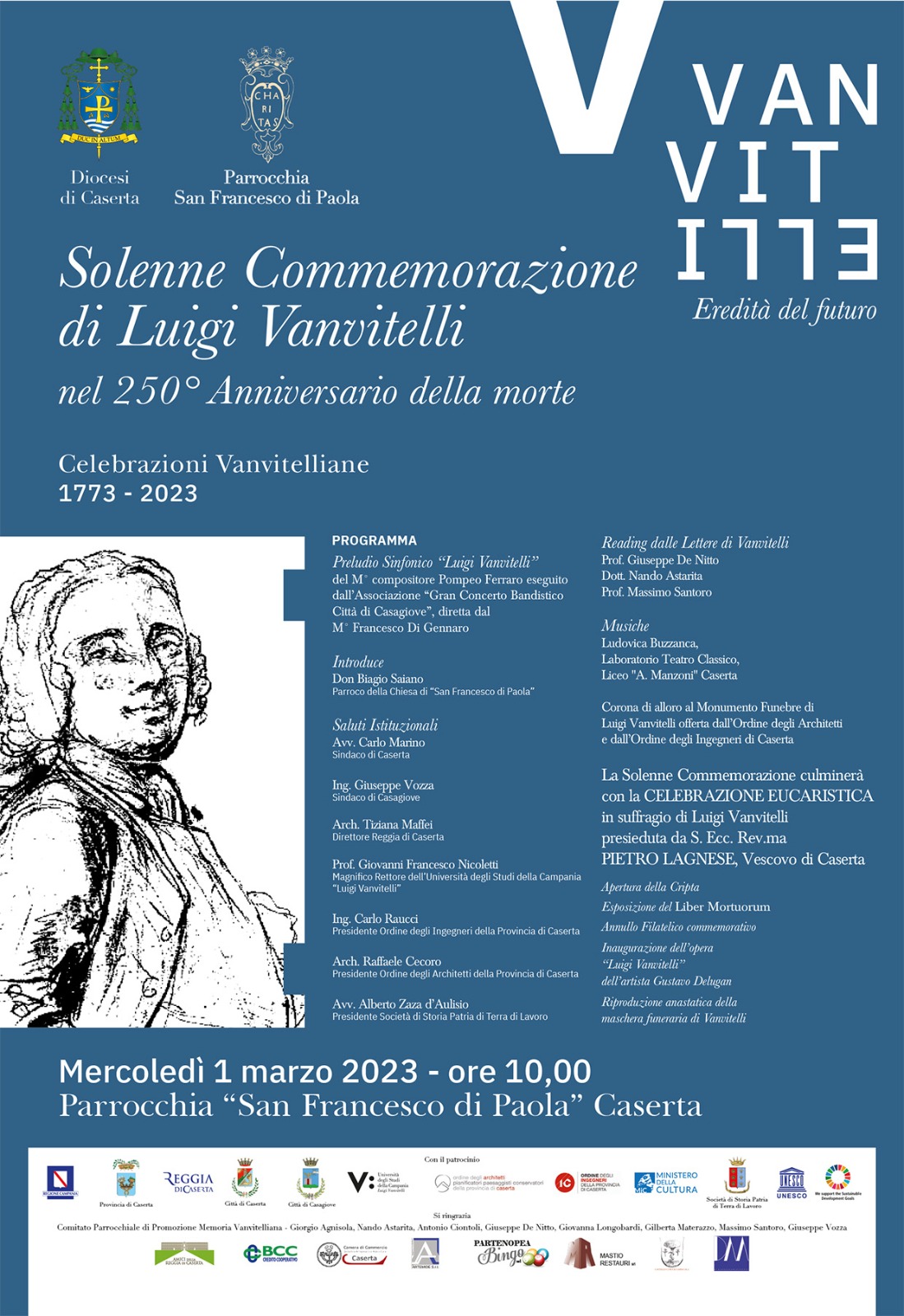 Domani Mercoledì 1° Marzo alle ore 10 presso la Parrocchia San Francesco di Paola, si terrà la Solenne Commemorazione di Luigi Vanvitelli, insignita della Medaglia del Presidente della Repubblica, nel 250° Anniversario della morte. La celebrazione eucaristica sarà presieduta dal Vescovo di Caserta Mons. Pietro Lagnese. Il programma prevede un preludio sinfonico e un reading delle lettere di Vanvitelli.