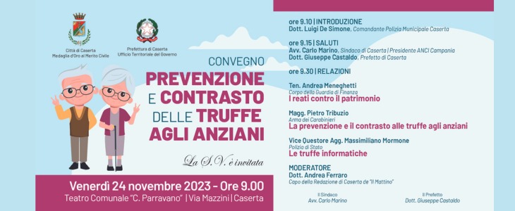 Venerdì 24 novembre alle ore 9, presso il Teatro Comunale “Parravano”, è in programma il convegno dal titolo “Prevenzione e contrasto delle truffe agli anziani”, che si inserisce all’interno del progetto “Informare per prevenire”, realizzato in sinergia dal Comune di Caserta e dalla Prefettura di Caserta. I lavori, che saranno moderati dal Responsabile della redazione di Caserta de “Il Mattino”, Andrea Ferraro, prenderanno il via con l’introduzione del Comandante della Polizia Municipale, Luigi De Simone, alla quale seguiranno i saluti istituzionali del Sindaco di Caserta e Presidente di ANCI Campania, Carlo Marino, e del Prefetto di Caserta, Giuseppe Castaldo. Successivamente, spazio alle relazioni del Tenente della Guardia di Finanza Andrea Meneghetti sul tema “I reati contro il patrimonio”, del Maggiore dei Carabinieri Pietro Tribuzio su “La prevenzione e il contrasto alle truffe agli anziani” e del Vice Questore Aggiunto della Polizia di Stato Massimiliano Mormone sul tema “Le truffe informatiche”. Il progetto “Informare per prevenire” si pone l’obiettivo di mettere in campo azioni finalizzate, in via prioritaria, ad informare gli anziani sui comportamenti di autoprotezione da adottare nella vita quotidiana e a fornire i contatti utili per segnalare qualsiasi situazione di pericolo, denunciare eventuali azioni dannose e chiedere sostegno psicologico qualora, a truffa avvenuta, subentri una situazione di disagio e di angoscia.