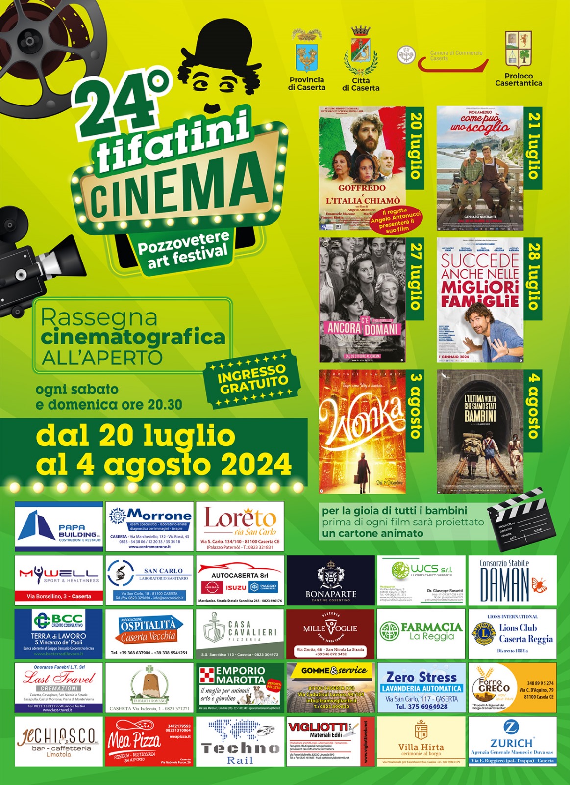 Sabato 20 luglio prenderà il via la 24esima edizione di “Tifatini Cinema”, la rassegna cinematografica all’aperto, patrocinata dal Comune di Caserta e completamente gratuita, che proporrà ogni sabato e domenica (alle 20,30) fino al 4 agosto la proiezione di film in piazza dei Colli Tifatini a Pozzovetere. Sei i titoli in programma e si partirà sabato 20 luglio alle ore 20,30 con ospite il regista Angelo Antonucci, che presenterà il suo film “Goffredo e l’Italia chiamò”, che aprirà il cartellone. Dopo la proiezione, spazio a una degustazione di prodotti tipici. Nel corso della rassegna, prima di ogni film, verrà proiettato un cartone animato, per la gioia dei più piccoli.