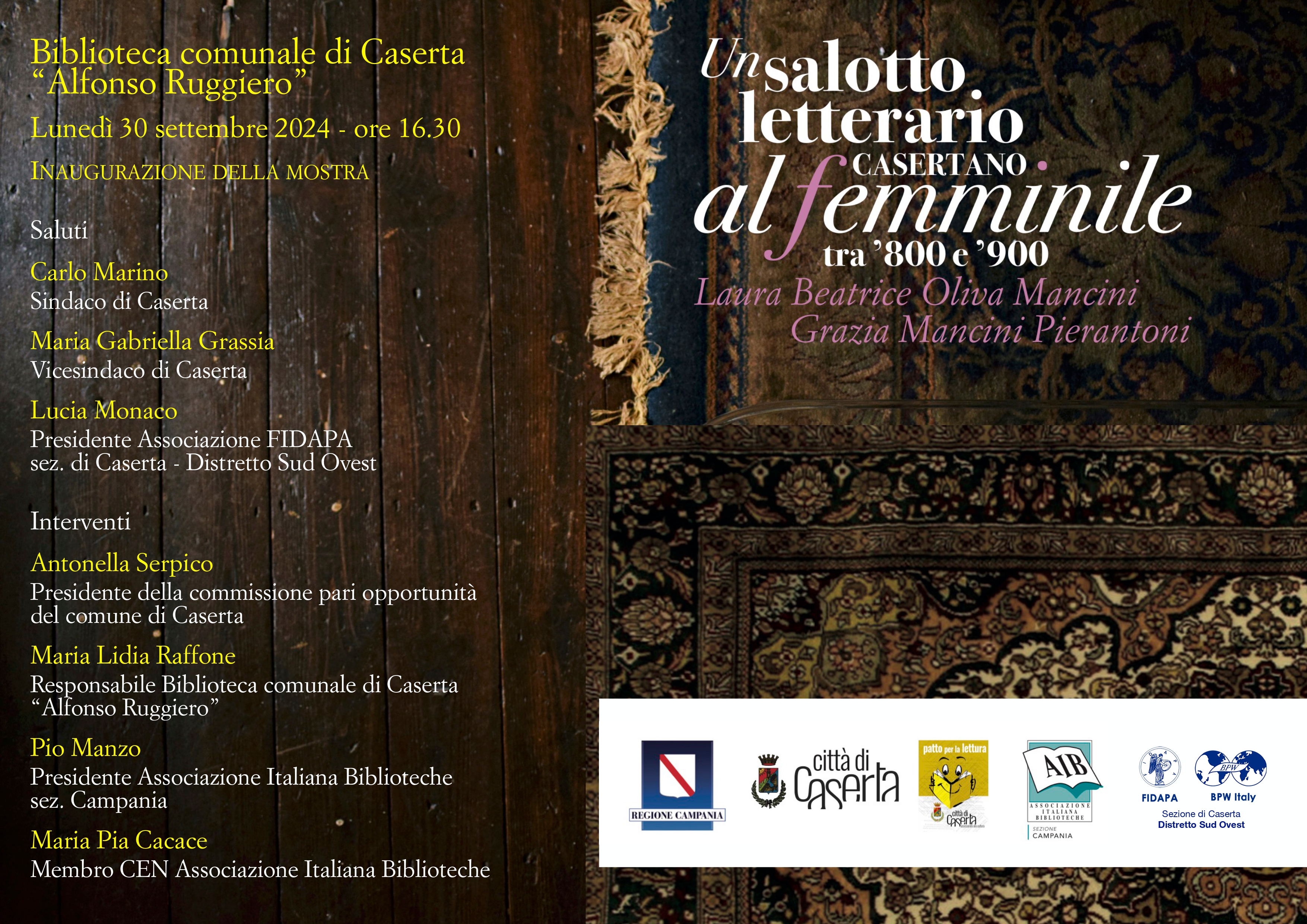 Lunedì 30 settembre, alle ore 16.30, sarà inaugurata presso la Biblioteca Comunale “Ruggiero” in via Laviano la mostra bibliografica “Un salotto letterario casertano al femminile tra l’Ottocento ed il Novecento: Laura Beatrice Oliva Mancini e Grazia Mancini Pierantoni”. La mostra, realizzata grazie al contributo della UOD Promozione e valorizzazione dei musei e delle biblioteche della Regione Campania, è stata curata dal Comune di Caserta, in collaborazione con AIB (Associazione Italiana Biblioteche) Campania e la Sezione di Caserta dell’Associazione Fidapa. La mostra resterà in Biblioteca fino all’inizio dei lavori (realizzati con fondi PNRR) che interesseranno la struttura di via Laviano a partire dall’inizio del mese di novembre. Contestualmente, l’iniziativa sarà itinerante, interesserà diversi istituti culturali e scolastici dell’intera regione, e sarà presente anche presso il Teatro Comunale “Parravano” di Caserta.