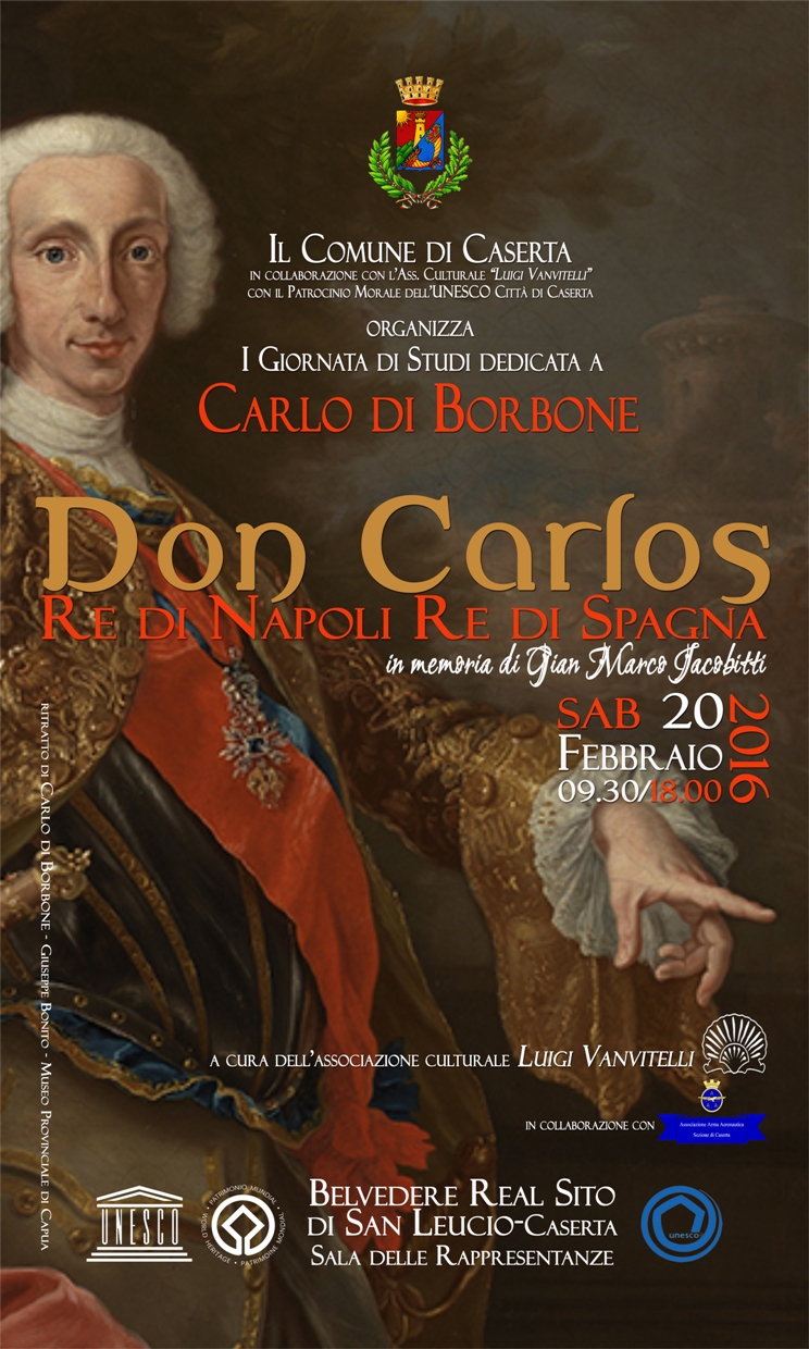 Sabato 20 Febbraio 2016 (con sessioni 09,30/13,30-14,30/18,00) presso la Sala delle Rappresentanze del Real Sito di San Leucio si terrà la prima di un ciclo di Giornate Studio dedicate a Carlo di Borbone, in occasione dei trecento anni dalla nascita. Organizzato dal Comune di Caserta in collaborazione con l’Associazione Culturale “Luigi Vanvitelli”, il convegno tratterà alcune delle principali tematiche sul Regno e sulle opere del grande sovrano, alla presenza delle maggiori istituzioni del territorio.