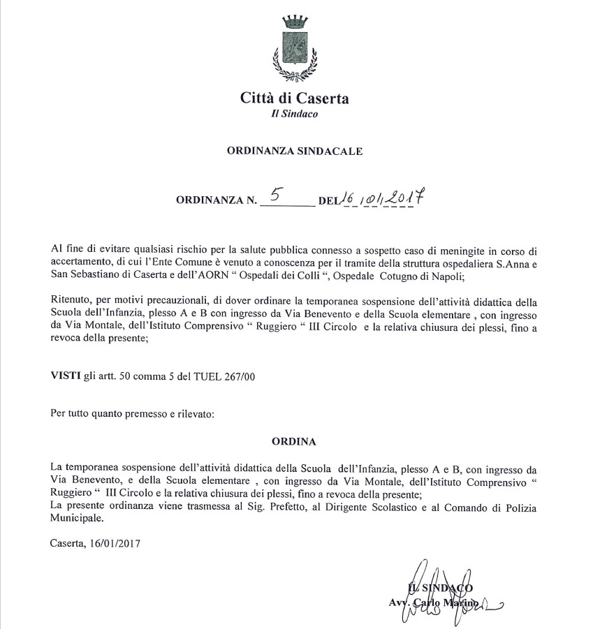 Si allega l'ordinanza firmata dal sindaco Carlo Marino in qualità di autorità sanitaria per la chiusura, in via precauzionale, A PARTIRE DA DOMANI 17 GENNAIO della Scuola dell'infanzia di via Benevento e della scuola elementare di via Montale dell'Istituto Comprensivo Ruggiero III Circolo. Il provvedimento è stato deciso al fine di evitare qualsiasi rischio per la salute pubblica connesso ad sospetto caso di meningite in corso di accertamento