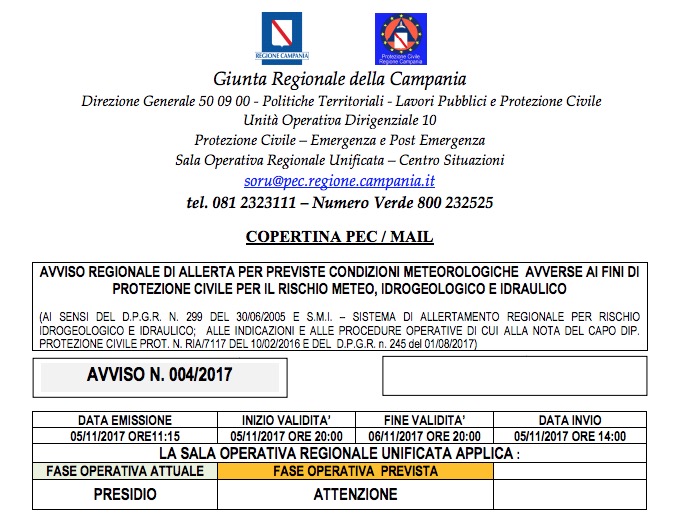 La Protezione Civile della Campania ha diramato una allerta meteo sull'intera regione dalle ore 20 di oggi, domenica 5 novembre, fino alle 20 di domani, lunedì 6 novembre, a causa delle forti precipitazioni previste. Per la zona 1 - Piana Campana nella quale rientra anche la città di Caserta, il livello di allerta è “arancione”. Il Comando di Polizia Municipale ha rinforzato i propri servizi di vigilanza e di monitoraggio, con priorità alle frazioni pedemontane ed alle aree a maggior rischio idrogeologico. In particolare il C.O.C. (Centro Operativo Comunale) sarà attivo dalle 20 di questa sera con un operatore in centrale e due pattuglie. Con l'arrivo dei primi fenomeni temporaleschi si raccomanda la massima prudenza, soprattutto alla guida degli autoveicoli. Per qualsiasi problema o segnalazione, sarà possibile contattare la Sala Operativa del Corpo (0823/210014).
