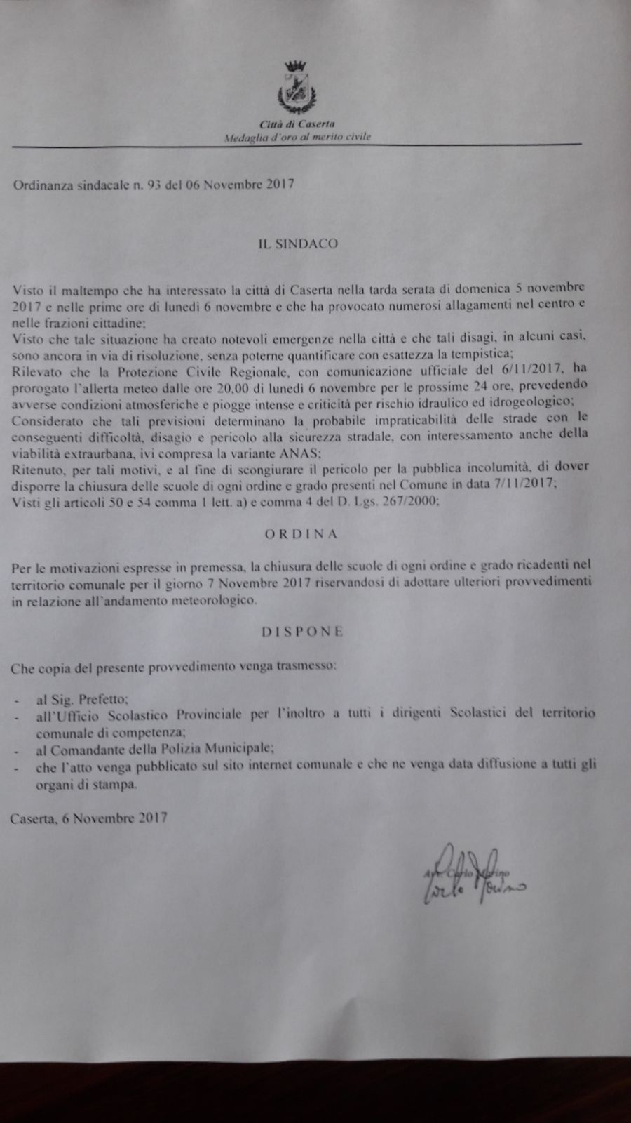 Alla luce della proroga dell’allerta meteo fino alle ore 20 di domani martedì 7 novembre, diramata dalla Protezione Civile della Regione Campania, il sindaco di Caserta, Carlo Marino, ha firmato un’ordinanza con la quale ha stabilito la chiusura delle scuole di ogni ordine e grado, in previsione di condizioni atmosferiche avverse e piogge intense che potrebbero creare ulteriori problemi dopo le fortissime precipitazioni della scorsa notte, che hanno generato allagamenti nel centro e nelle frazioni.