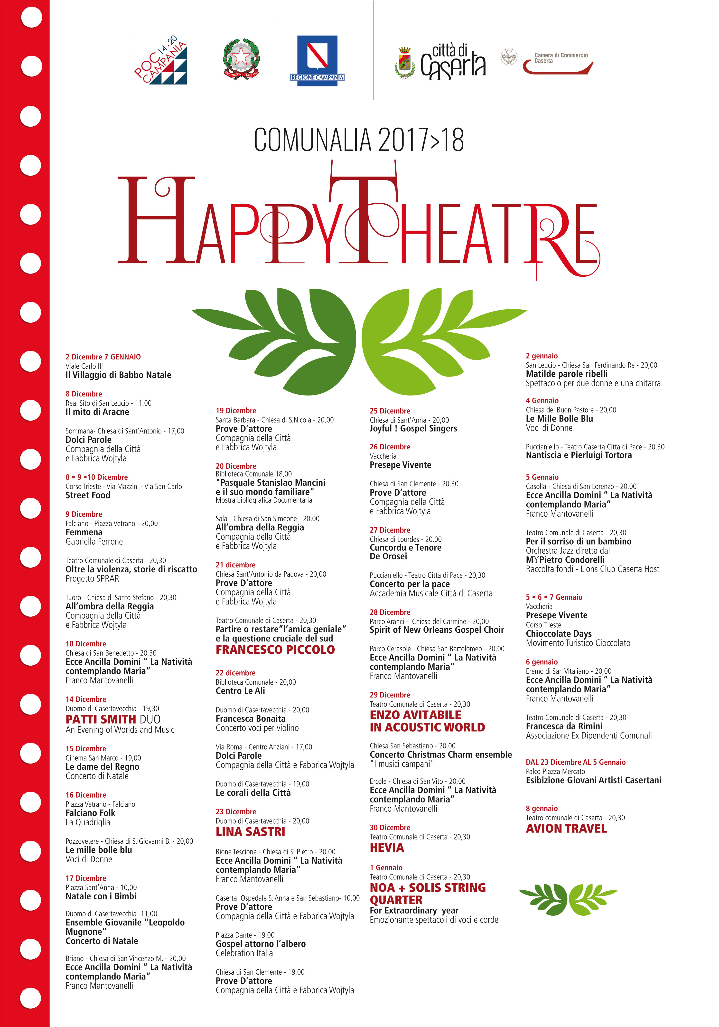 Si spazierà dai concerti ai reading letterari, passando per il teatro, che rappresenterà il vero elemento caratterizzante dell’intera manifestazione. In tal senso, diverse compagnie teatrali della città di Caserta saranno assolute protagoniste. Inoltre, spazio ad iniziative che costituiscono una grande tradizione per la città, come il Presepe Vivente della Vaccheria, o assolute novità, come il Villaggio di Babbo Natale su viale Carlo III. E poi ancora la pista di pattinaggio sul ghiaccio, lo street food, la festa della cioccolata, i mercatini di Natale su corso Trieste e gli spettacoli musicali di grande qualità all’interno delle chiese di ogni quartiere di Caserta.