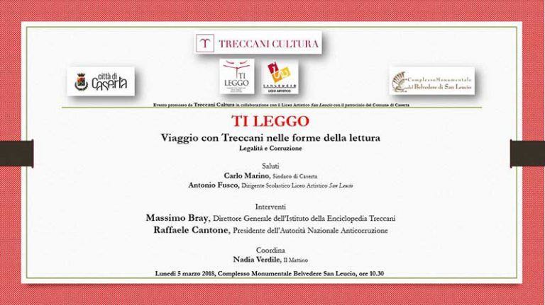 Lunedì 5 marzo alle ore 10,30 presso il Belvedere di San Leucio è in programma l’evento “Ti leggo: viaggio con Treccani nelle forme della lettura – Legalità e Corruzione”, organizzato da Treccani Cultura in collaborazione con il Liceo Artistico “San Leucio” e con il patrocinio del Comune di Caserta. Interverranno il presidente dell’Autorità Nazionale Anticorruzione, Raffaele Cantone, e il direttore generale dell’Istituto della Enciclopedia Treccani, Massimo Bray. Ad introdurre i lavori, moderati dalla giornalista de “Il Mattino”, Nadia Verdile, saranno i saluti del sindaco di Caserta, Carlo Marino, e del dirigente scolastico del Liceo Artistico “San Leucio”, Antonio Fusco.