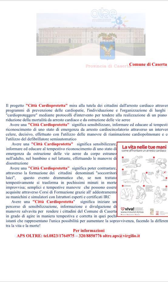 Domani, venerdì 18 maggio alle ore 11, presso la Sala Giunta del Comune di Caserta, è in programma la conferenza stampa di presentazione del progetto "Verso una città cardioprotetta", realizzato dal Comune in collaborazione con l'associazione di promozione sociale e culturale "Oltre". Nel corso della conferenza, alla quale prenderanno parte, tra gli altri, il sindaco di Caserta, Carlo Marino, e l'assessore agli Eventi e alle Attività Produttive, Emiliano Casale, saranno illustrati i dettagli del progetto, che prevede iniziative miranti all'informazione e alla formazione dei cittadini alle manovre di rianimazione cardiopolmonare attraverso l'utilizzo del defibrillatore semiautomatico e alla disostruzione delle vie aeree degli adulti, dei bambini e dei lattanti.