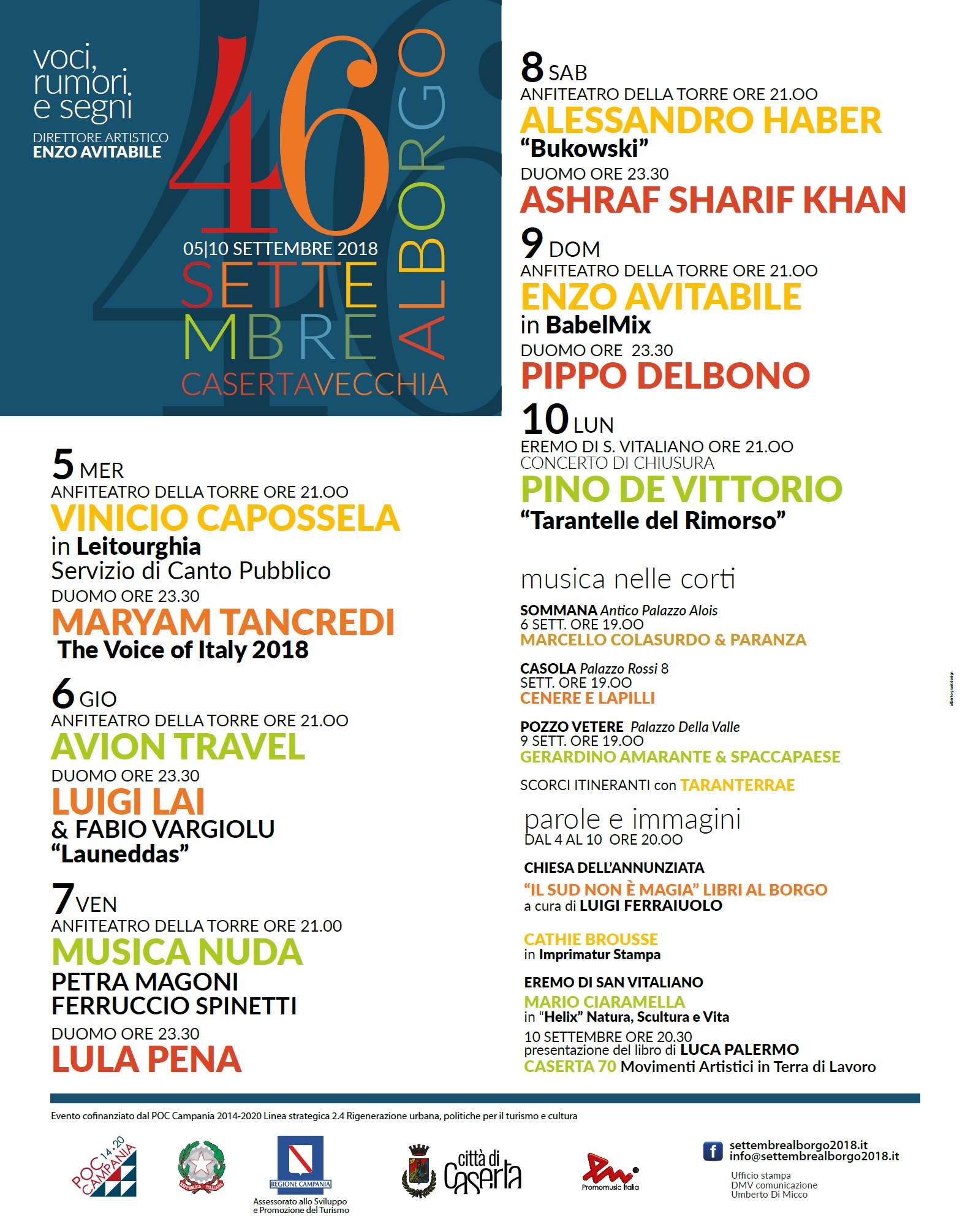 Si comincia il 4 settembre con un doppio appuntamento, che è anche una anteprima al vero e proprio «Settembre al Borgo». Alle 20, nella Duomo di Casertavecchia, ci sarà «UN PALLIDO SOLE CHE SCOTTA: VIAGGIO NELLE (RI)SCRITTURE MERIDIANE» con Francesco De Core, saggista, caporedattore «Il Mattino», autore del testo che dato il titolo al confronto; Andrea Di Consoli, scrittore, autore di «Unomattina»; Elisa Ruotolo, scrittrice, finalista al «Premio Strega»; Gabriel Zuchtriegel, direttore del Parco archeologico di Paestum. Modera Piero Sorrentino, conduttore di Zazà, Radio3 Rai, che indaga settimanalmente proprio la cultura e la società meridionale. I momenti dell’incontro saranno accompagnati alla chitarra di Ubaldo Tartaglione. Le letture dei passi scelti saranno dell’attore Piero Grant.
