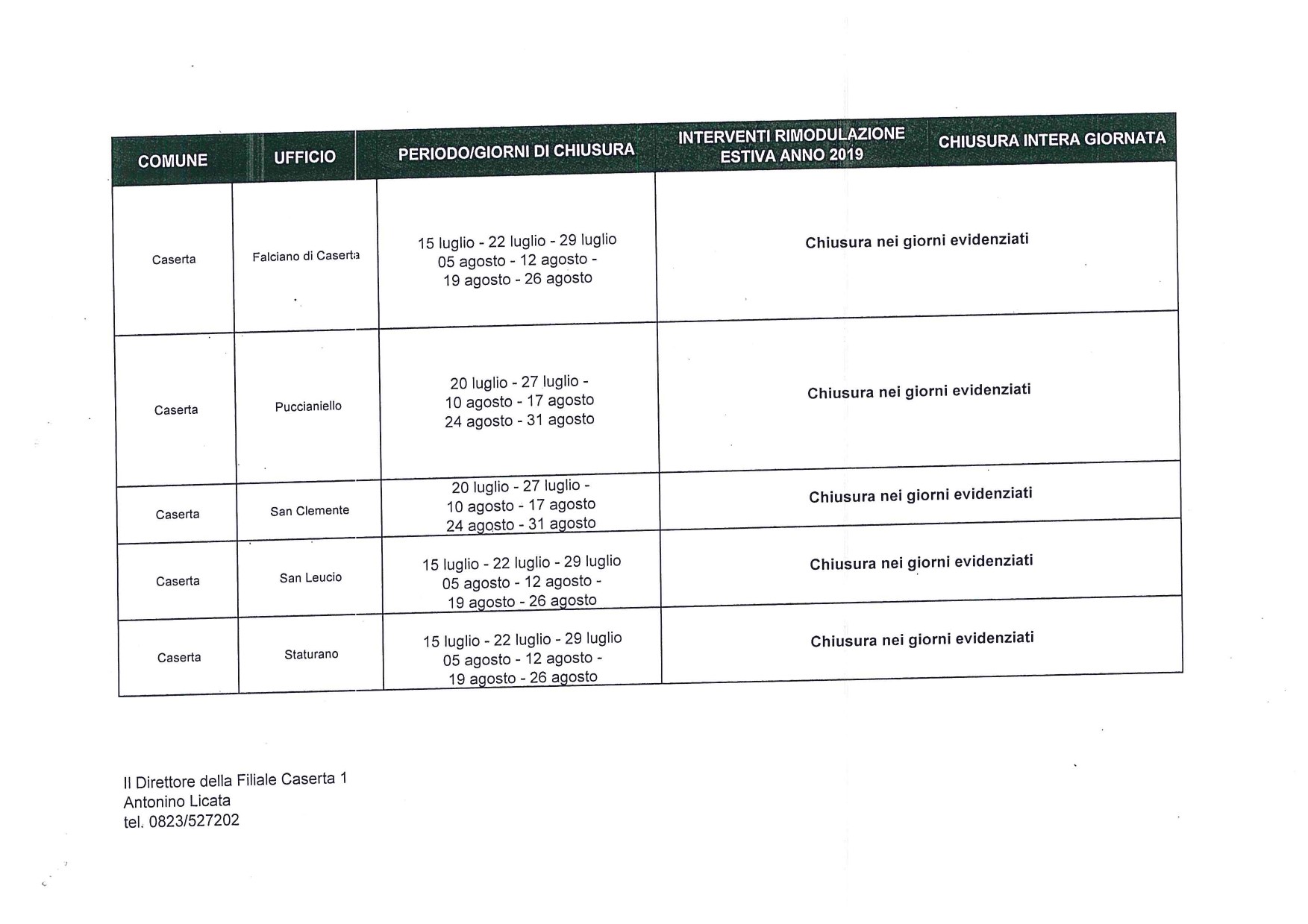 La Direzione della Filiale PT di caserta ha reso note al Comune le aperture estive degli Uffici Postali, valide nei mesdi di luglio ed agosto.