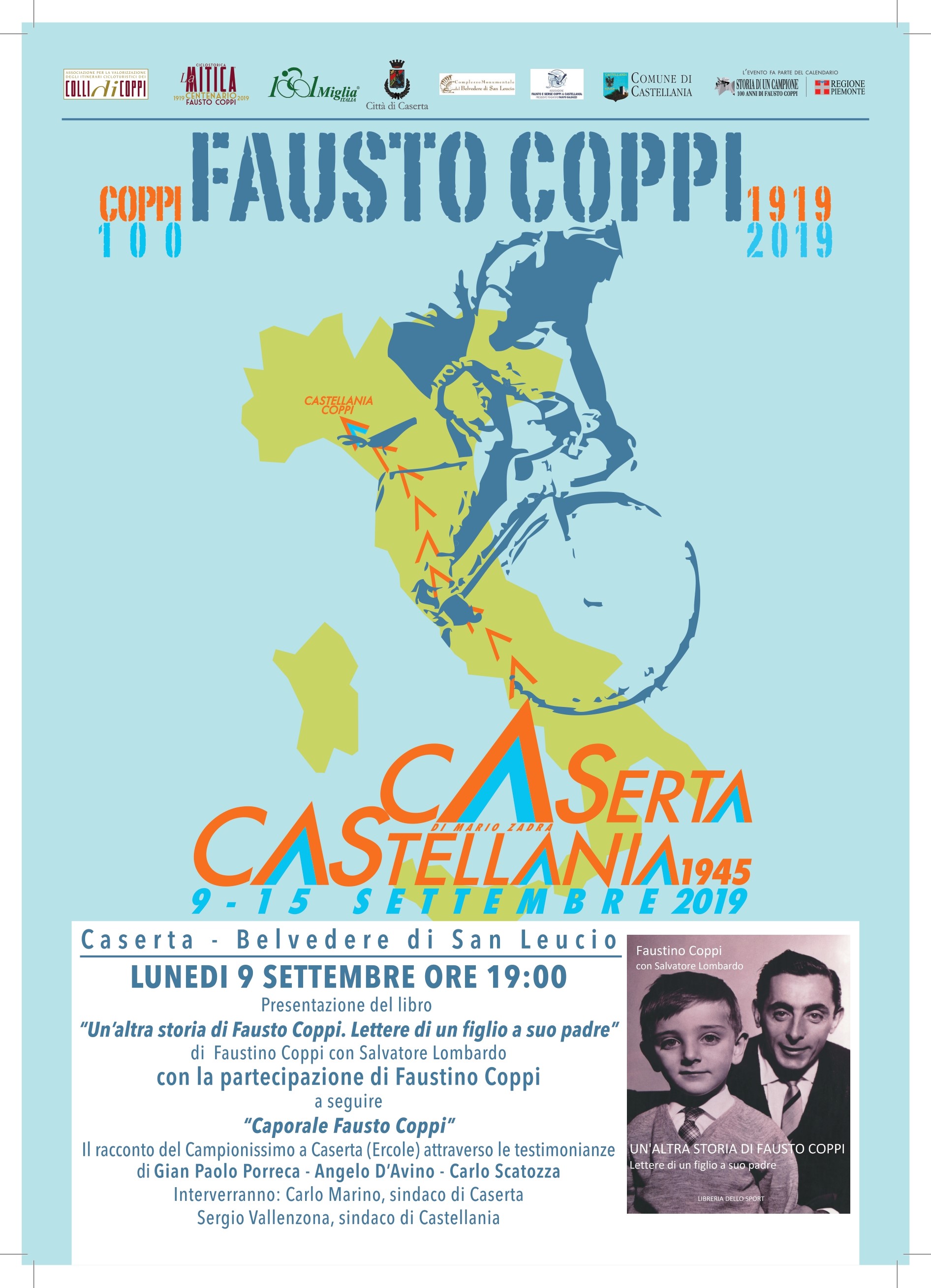 Lunedì 9 settembre, alle ore 19.00, il Reale Belvedere di San Leucio ospiterà la presentazione di un libro dedicato a Fausto Coppi. Martedì 10 settembre, alle ore 9.00 da Ercole, la partenza della prima tappa del percorso, Caserta - Formia.