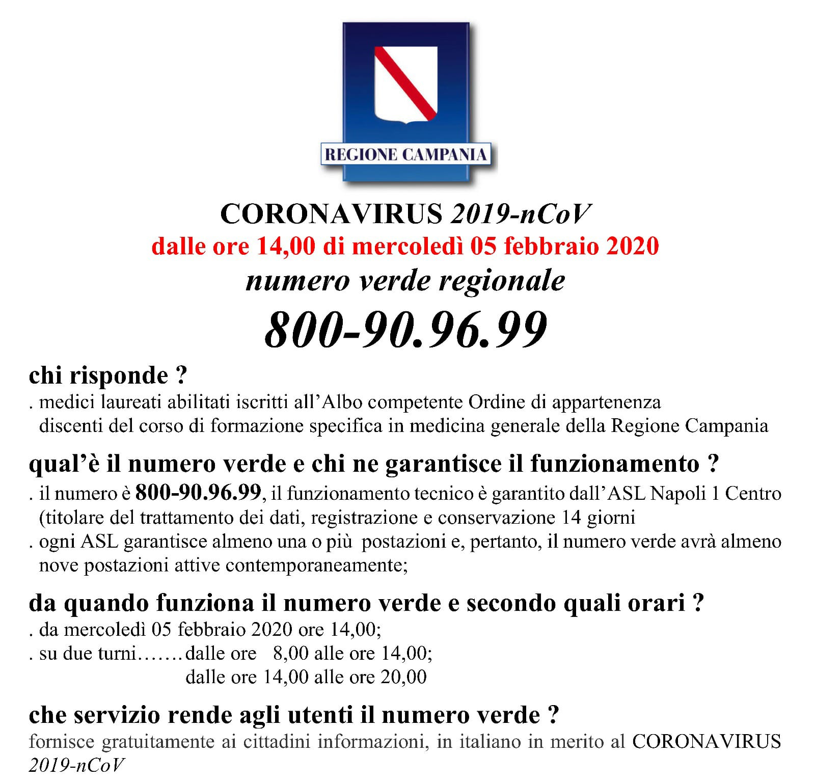 In allegato, l'Avviso della Regione Campania con tutte le indicazioni sul Numero Verde gratuito relativo al Coronavirus.