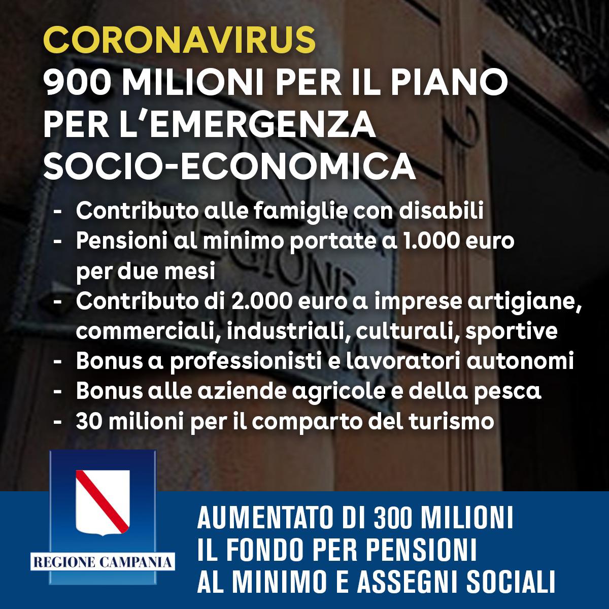 “Con un ulteriore straordinario sforzo nel reperimento di risorse, il fondo per il Piano Socio Economico della Regione Campania è stato portato a 900 milioni di euro. L'incremento di altri 300 milioni in aggiunta ai 600 già stanziati, consentirà di aumentare tutte le pensioni al minimo e gli assegni sociali. Intanto si sta completando il lavoro per la definizione della platea dei beneficiari di tutte le misure di sostegno previste dal Piano della Regione, e per l'attivazione della piattaforma informatica che consentirà di accedere alle stesse.