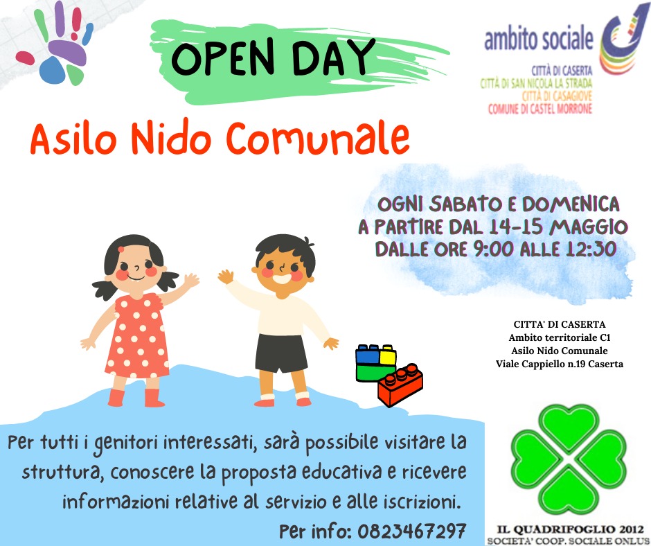 A partire dal weekend del 14 e 15 maggio, ogni sabato e domenica, dalle 9,00 alle 12,30, sarà possibile visitare l’asilo nido comunale di viale Cappiello. La struttura, gestita quest’anno dalla Cooperativa Sociale Il Quadrifoglio 2012 per conto dell’Ambito Sociale C1, resterà aperta grazie agli open day organizzati per permettere ai genitori interessati di visitare i locali, conoscere la proposta educativa e ricevere ogni informazione relativa ai servizi offerti e alle iscrizioni.