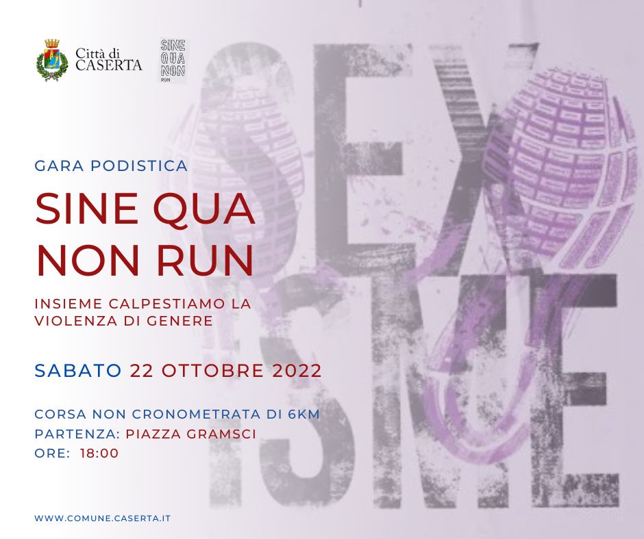 È patrocinata dal Comune di Caserta la prima edizione italiana della celebre gara podistica “Sine qua non run”, che si svolge ogni anno a Parigi. L’appuntamento è per sabato 22 ottobre alle 18. La gara, aperta a uomini e donne, consisterà in una corsa non cronometrata di 6 km che partirà da piazza Gramsci, attraverserà tutto il centro storico di Caserta e, al fine di instaurare un momento di forte condivisione, si svolgerà contemporaneamente a quella parigina.