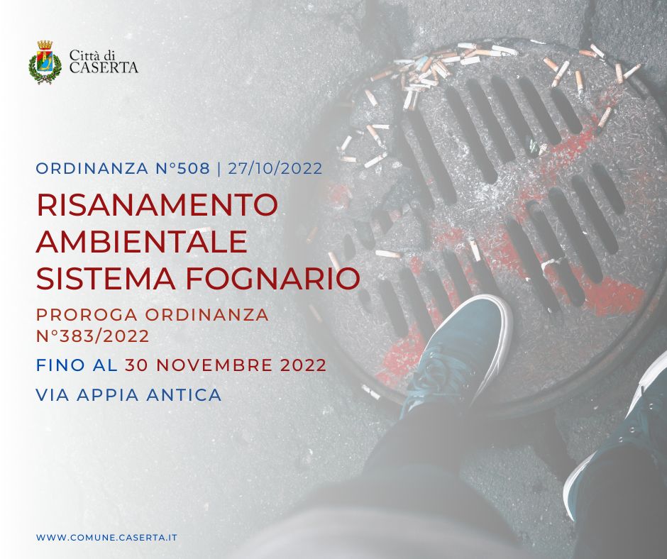 - Premesso che nell’ambito del programma di risanamento ambientale e funzionale del sistema fognario della Città di Caserta, con propria ordinanza n°383/2022, sono state istituite alcune modifiche temporanee della segnaletica stradale in via Appia Antica nel tratto compreso tra Viale Carlo III° e Via Mattei;