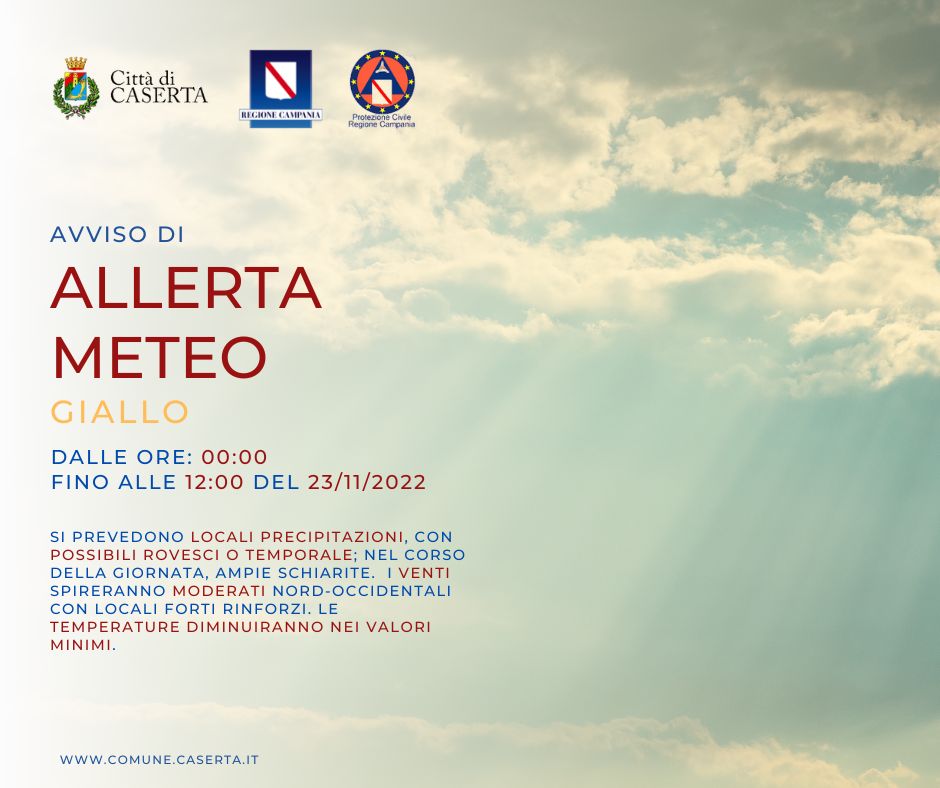 La Protezione Civile della Regione Campania, ha emanato un nuovo avviso di #allertameteo valido sull'intero territorio regionale valido dalle ore 00:00 fino alle 12:00 di domani mercoledì 23 Novembre. Il livello dell'allerta è giallo su tutte le zone della Campania.