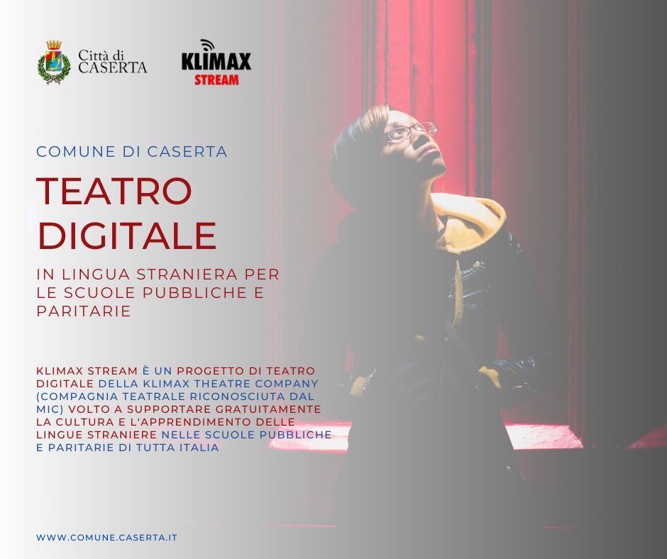 Il Comune di Caserta, tramite l’Ufficio Pubblica Istruzione, e l’associazione Klimax Theatre Company, con sede in Roma, hanno sottoscritto un accordo di partenariato per distribuire gratuitamente il progetto “KLIMAX STREAM” a tutte le scuole di ordine e di grado pubbliche e paritarie del Comune di Caserta.