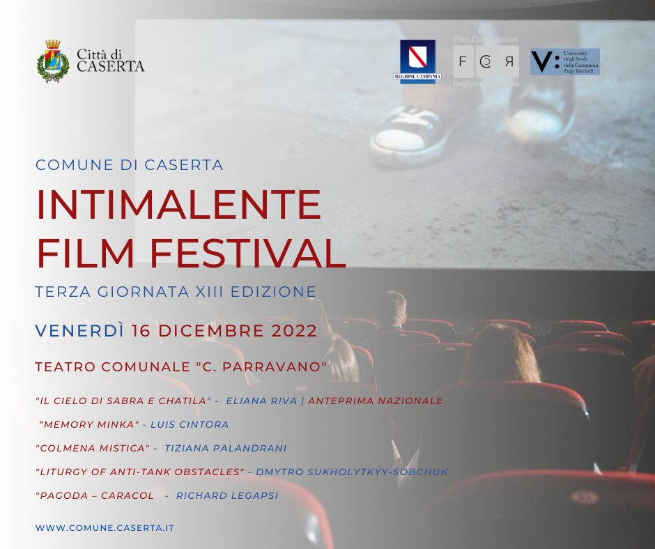 Ancora film da tutto il mondo, proiezioni per le scuole e l’anteprima nazionale di un docu-reportage di una giovane regista casertana. Questo in sintesi il programma di domani venerdì 16 dicembre di Intimalente Film Festival diretto da Augusto Ferraiuolo e Pasquale Corrado, editor e regia di Rino Della Corte, organizzato dal Comune di Caserta in collaborazione con Olà Fabbrica Creativa, con il patrocinio e il contributo della Regione Campania e della Campania Film Commission e il patrocinio dell'Università degli Studi della Campania "Luigi Vanvitelli".
