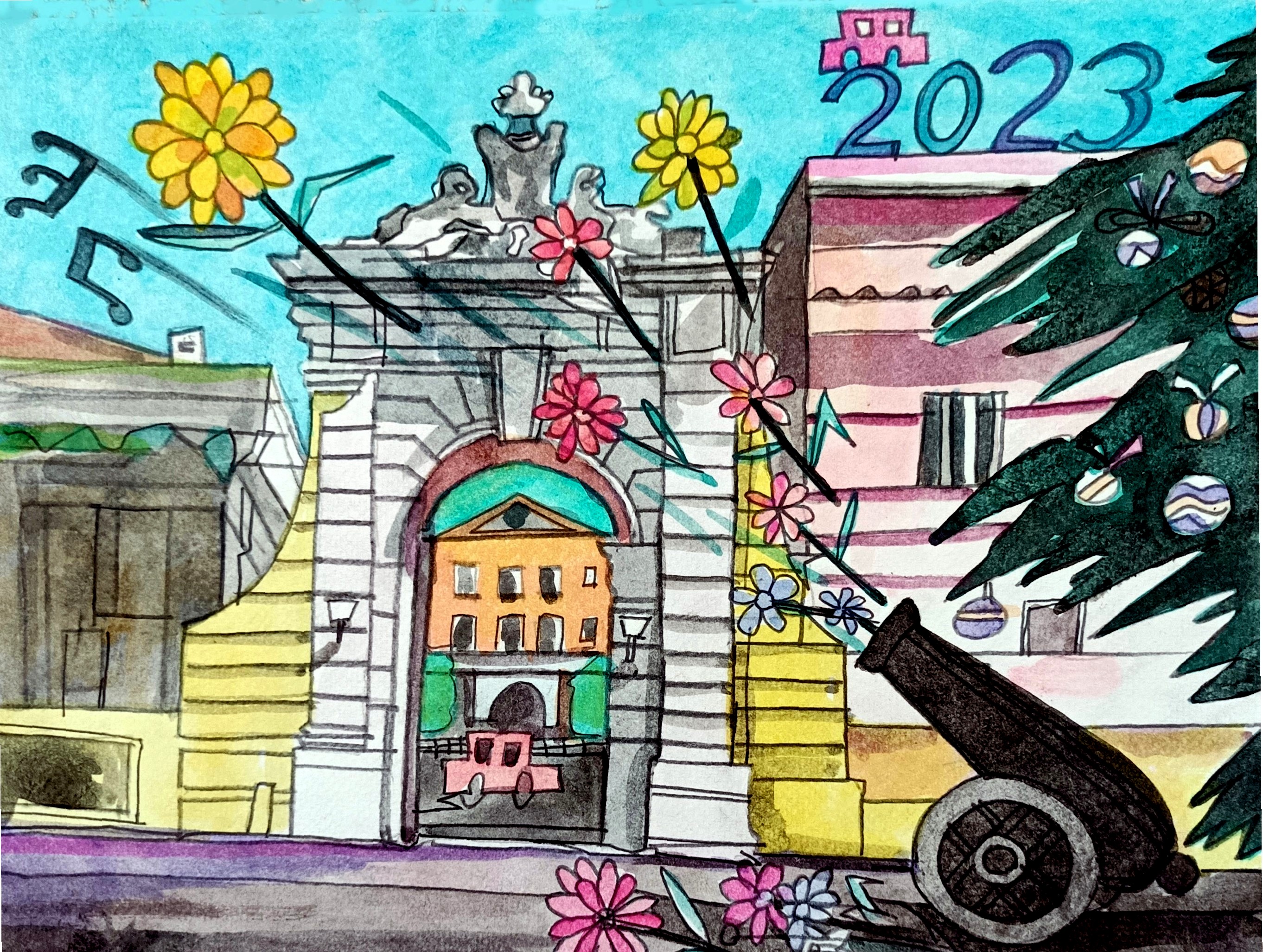 Quest’anno l’appello del sindaco è accompagnato da un suggestivo acquarello “no war” di Alessandro Del Gaudio, dedicato al 2023 e realizzato per l’Amministrazione comunale. L’artista casertano, raffigurando il portale di San Leucio all’arrivo del 2023, si è ispirato ai versi della canzone “Proposta” del gruppo musicale I Giganti: “Mettete dei fiori nei vostri cannoni…”. In realtà, è un invito a non utilizzare nessun tipo di sparo.