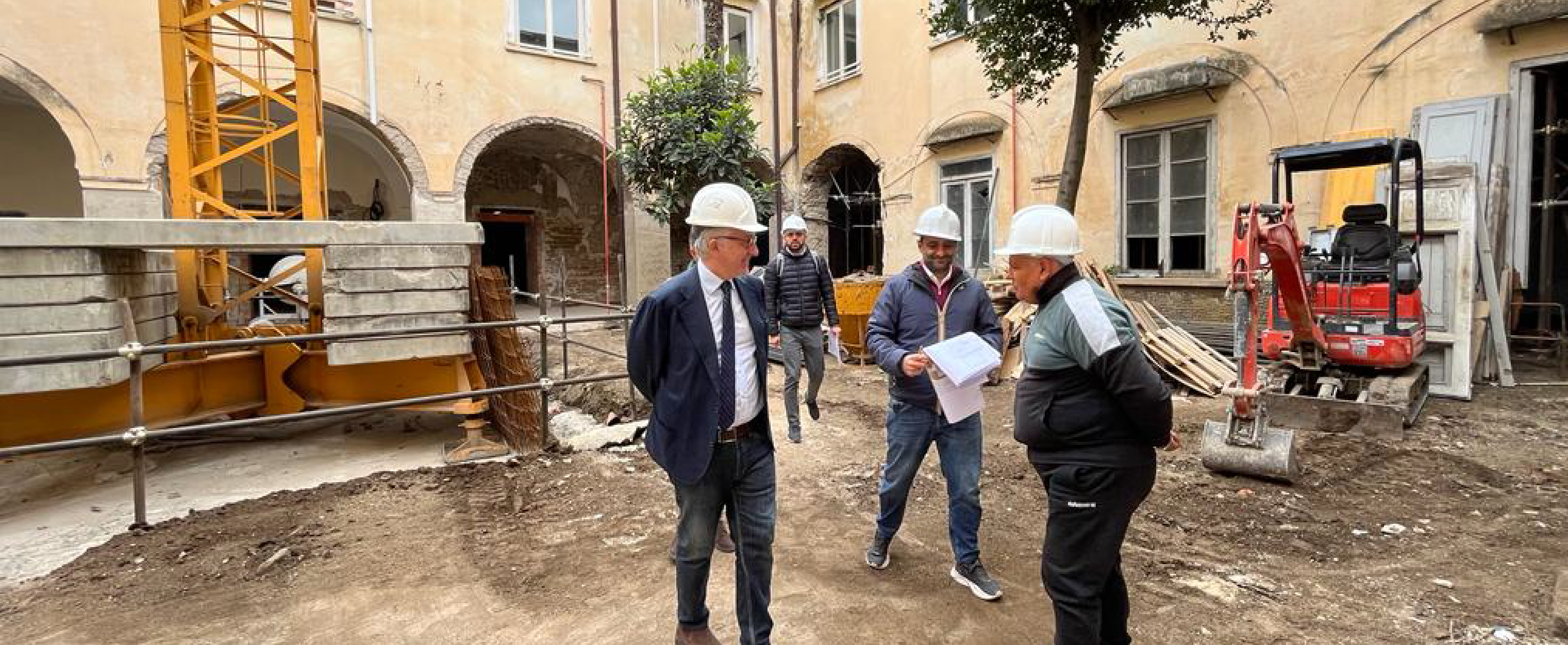 Stamani il Sindaco di Caserta, Carlo Marino (in foto n.d.r.), ha effettuato un sopralluogo presso il cantiere della Scuola Media “P. Giannone”, che sarà recuperata grazie ad un finanziamento ministeriale "Fondo Comma 140" di circa 2 milioni di euro. Tutta la scuola è interessata da un’imponente opera di riqualificazione che prevede anche il riuso e la rifunzionalizzazione dell’adiacente ex Orfanotrofio “Sant’Antonio” grazie al finanziamento di circa 8 milioni di euro nell’ambito del PNRR (Capitolo Rigenerazione Urbana). Accompagnato dai progettisti e dai responsabili del cantiere, il Sindaco ha iniziato la visita dal cosiddetto “Corpo A” di uno degli edifici più importanti della città e che ospita la scuola più antica di Caserta. -Si legge nella nota- Si è partiti dal piano terra, dove, nell’ambito dei complessivi interventi di recupero architettonico, saranno realizzati i laboratori di musica, teatro, arte e di giornalismo.