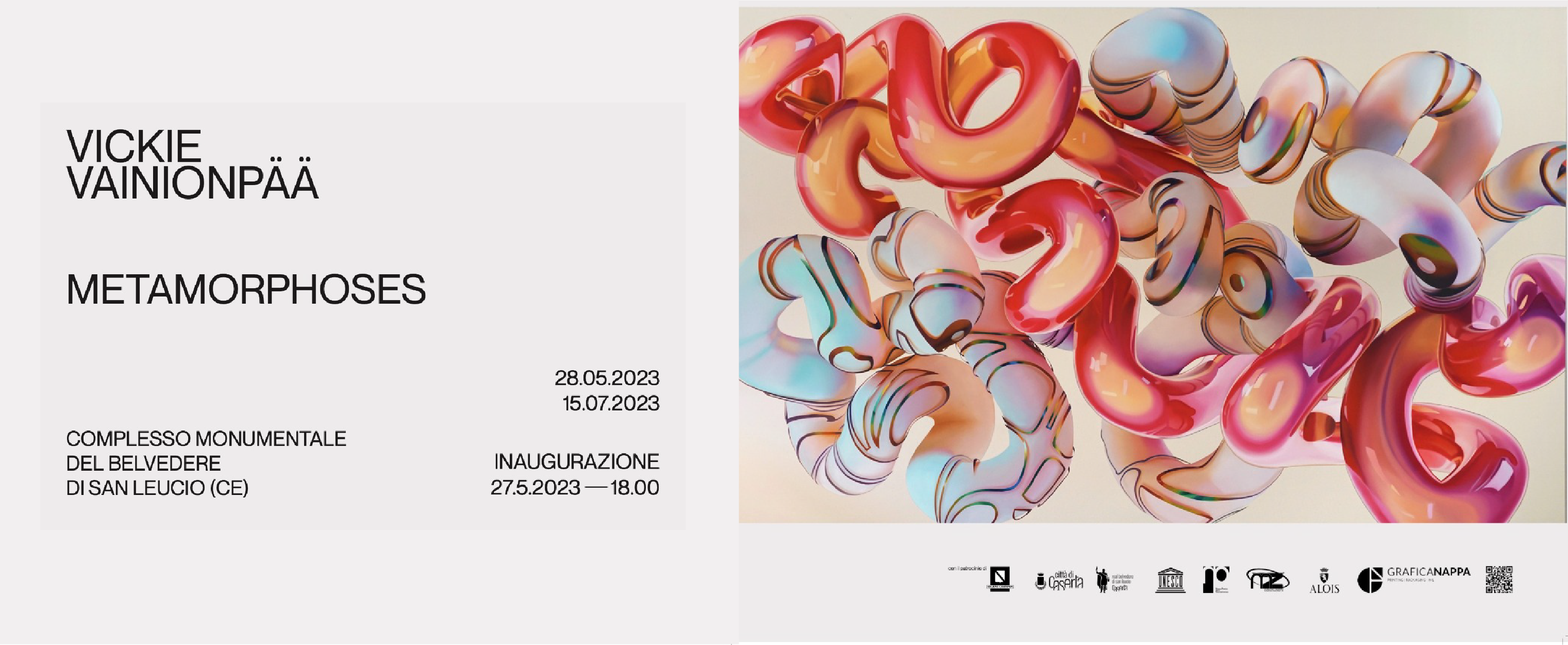 Il Comune di Caserta patrocina "Metamorphoses", la mostra personale della pittrice canadese Vickie Vainionpää che verrà inaugurata sabato 27 maggio alle ore 18 presso il Complesso Monumentale del Belvedere di San Leucio.