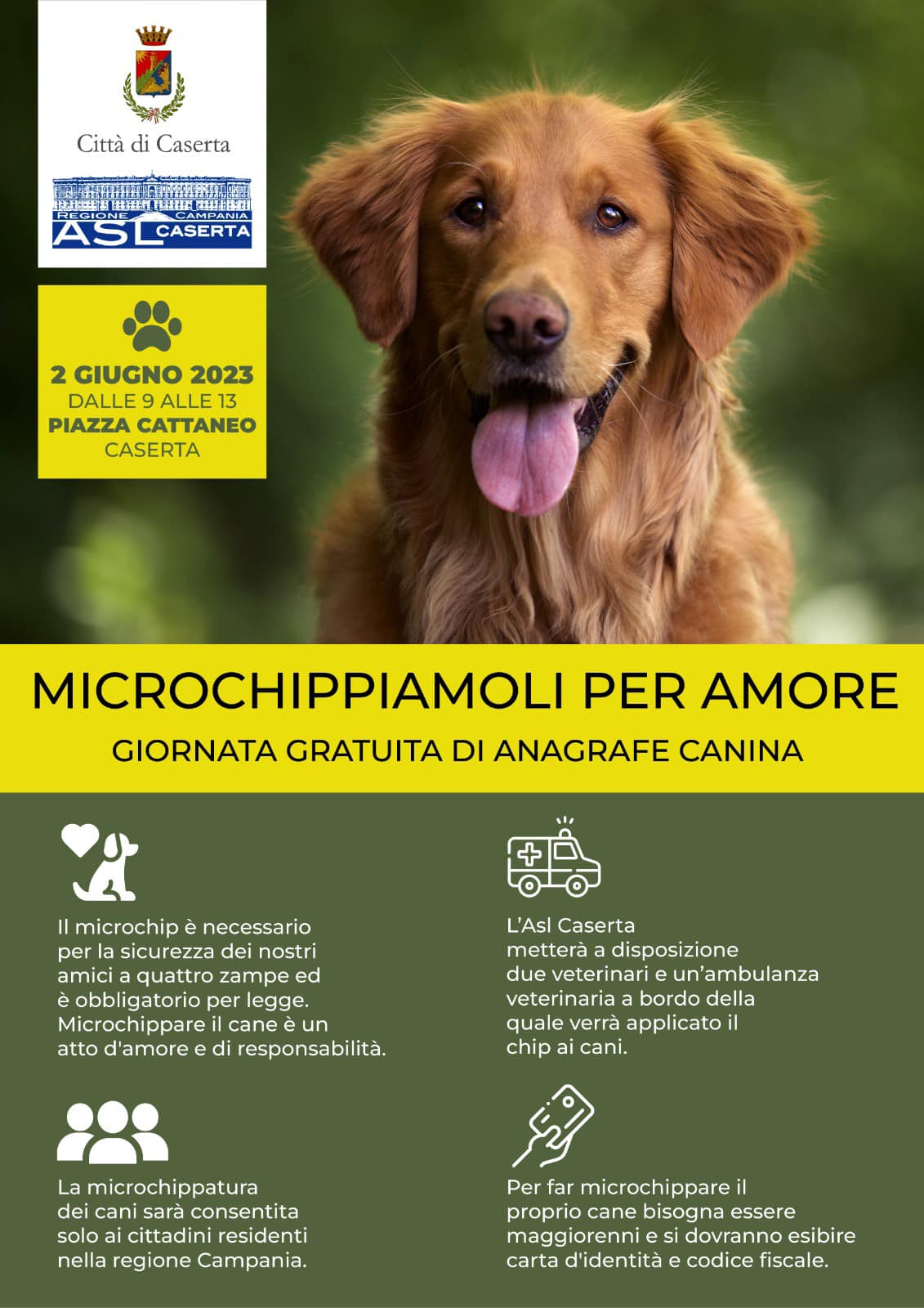Venerdì 2 giugno, dalle ore 9 alle ore 13 in piazza Cattaneo, ci sarà l’appuntamento con “Microchippiamoli per amore”, una giornata di anagrafe canina itinerante organizzata dal Comune di Caserta e dall’Asl Caserta, durante la quale i cittadini potranno far microchippare gratuitamente i propri cani.