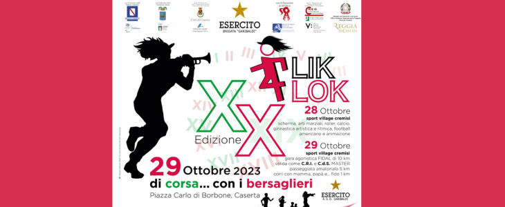 Caserta si appresta a vivere un evento unico e a "correre" insieme ai Bersaglieri in Piazza Carlo di Borbone. Nata nel 1991 come gara podistica prettamente militare, la Flik Flok negli anni č diventata una manifestazione aperta alla cittadinanza. Una vera e propria festa di sport, giunta alla ventesima edizione, organizzata dalla Brigata Bersaglieri "Garibaldi", con il patrocinio del Comune di Caserta.