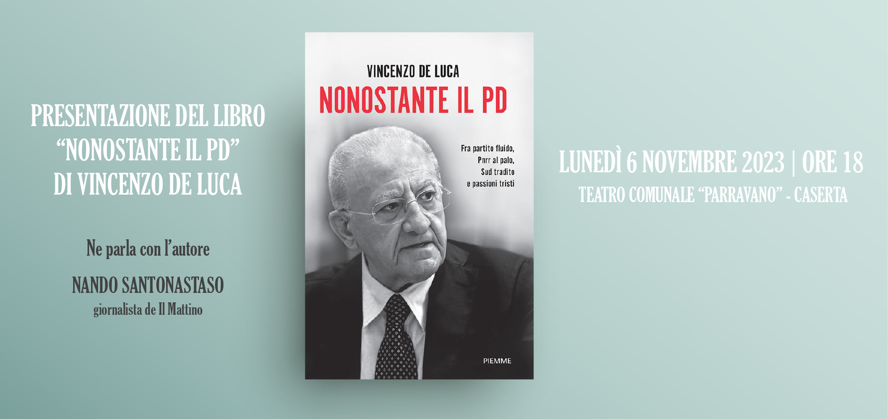 Lunedì 6 novembre alle ore 18, presso il Teatro Comunale “Parravano” di Caserta, il Presidente della Regione Campania, Vincenzo De Luca, presenterà il suo libro “Nonostante il Pd”. A dialogare con l’autore sarà il giornalista de “Il Mattino”, Nando Santonastaso.