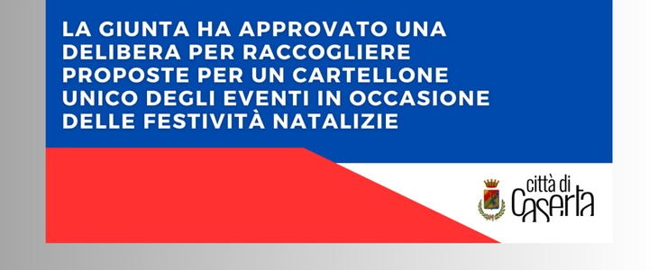 La Giunta Comunale ha approvato una delibera per raccogliere le proposte utili a dar vita a un cartellone unico di eventi, che si svolgerà nel corso delle festività natalizie. Questo provvedimento verrà sottoposto all’attenzione del Tavolo per il Turismo, convocato per domani, martedì 12 novembre, presso la sede del Comune di Caserta. Nei prossimi giorni, poi, sarà pubblicato anche un avviso che mira proprio a recepire le proposte che dovranno essere vagliate ed eventualmente inserite all’interno del cartellone unico.