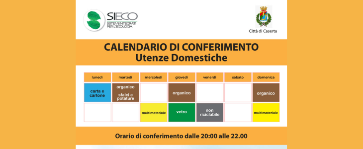 L'amministrazione comunale di Caserta considera l'ambiente una delle sue principali priorità. Sono in corso diverse iniziative, tra cui la distribuzione di materiale informativo relativo alla raccolta differenziata, realizzato dalla società Sieco. Queste informazioni permetteranno ai cittadini di conferire correttamente i rifiuti, promuovendo così una città più pulita e sostenibile. Si invita la cittadinanza a consultare il calendario e seguire le disposizioni indicate per un corretto conferimento. Per ulteriori informazioni, segnalazioni o prenotazioni per il ritiro gratuito dei rifiuti ingombranti e RAEE a domicilio, è possibile contattare il numero verde 800 016016.