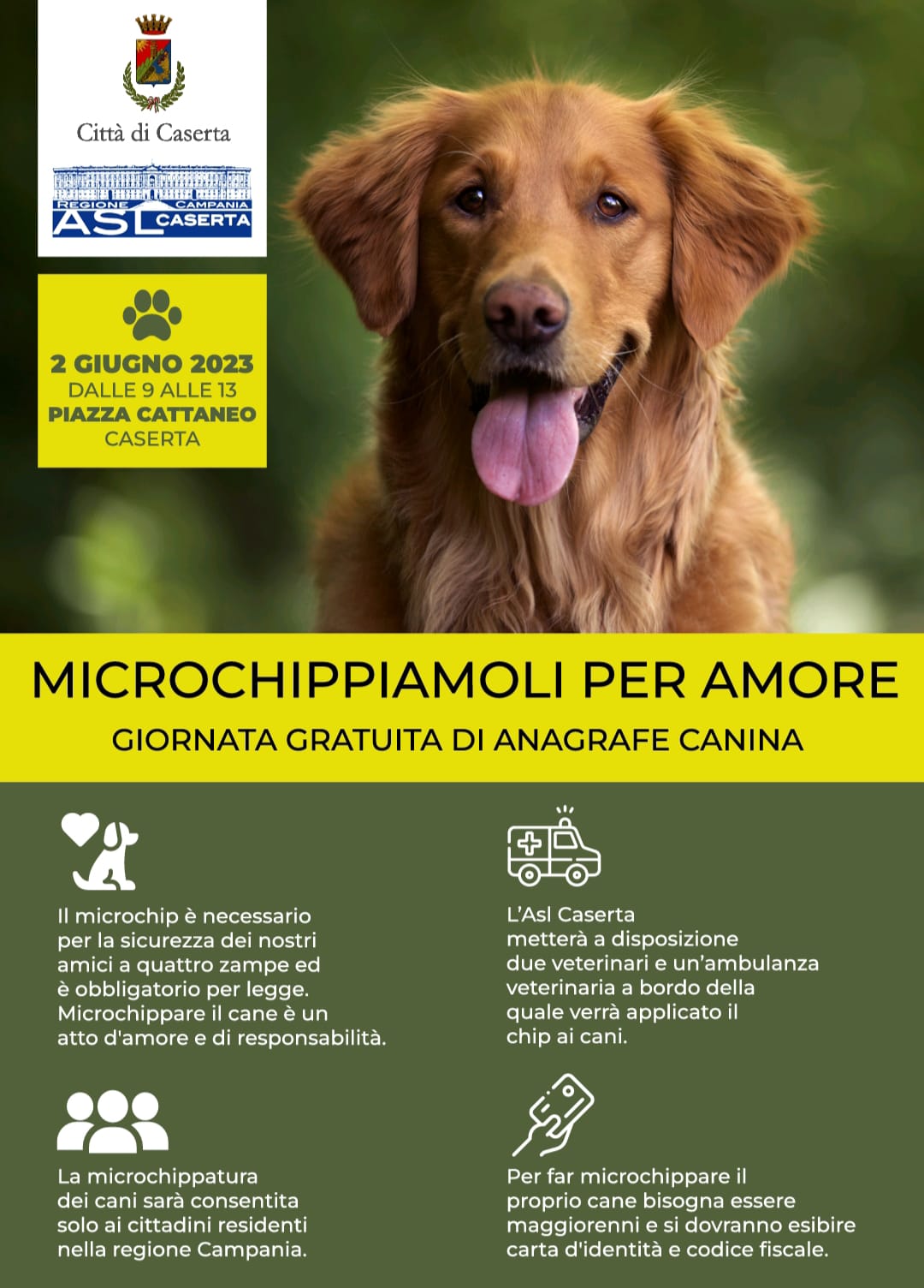 Sabato 19 ottobre 2024 , dalle 10 alle 19, e domenica 20 ottobre 2024, dalle 9 alle 14, in piazza Carlo di Borbone, nell'ambito della manifestazione Flik Flok, si terranno due appuntamenti con “Microchippiamoli per amore”. Si tratta di due giornate di anagrafe canina organizzate dalla Garante per i diritti degli animali del Comune di Caserta, Adriana Giusti, e dall’Asl Caserta, durante le quali i cittadini potranno far microchippare gratuitamente i propri cani al di sopra dei 12 mesi di età. L’Asl Caserta metterà a disposizione un'ambulanza veterinaria su cui verranno applicati i microchip dai dottori Aniello Ruggiero e Mauro Giaquinto. Per far microchippare il proprio cane bisogna essere maggiorenni e si dovranno esibire carta d'identità e codice fiscale. La microchippatura dei cani sarà consentita solo ai cittadini residenti nella regione Campania. Il microchip è necessario per la sicurezza dei nostri amici a quattro zampe ed è obbligatorio per legge. Microchippare il cane è un atto d’amore e di responsabilità. __________________________________________________________________________ Durante la manifestazione Flik Flok 2023 , organizzata dalla Brigata Bersaglieri Garibaldi, con il patrocinio del Comune di Caserta, si è tenuto il secondo appuntamento di anagrafe canina itinerante, con l'iniziativa " Microchippiamoli per amore", organizzata dal Comune di Caserta con la presenza della Garante per i Diritti degli Animali, Adriana Giusti e dall'ASL Veterinaria di Caserta con la presenza dei Dottori Aniello Ruggiero e Mauro Giaquinto.